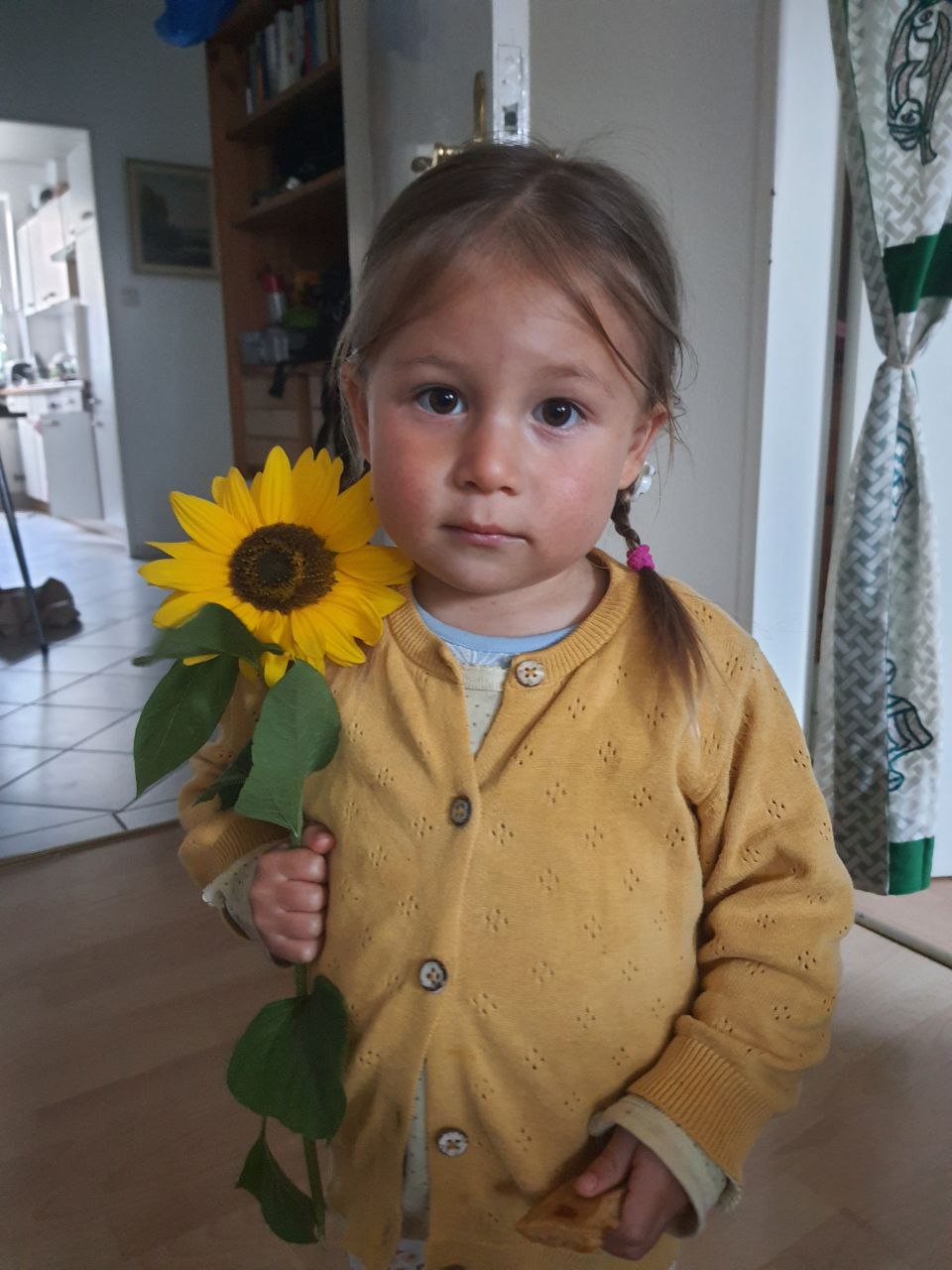 Sunflower gifted by Auntie Victoria, the waffle is homemade by Mom